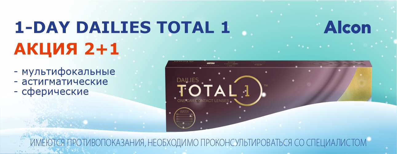 При покупке от 2-х упаковок контактных линз DAILIES TOTAL1 (сферические, торические или мультифокальные) Вы получаете 3-ю в подарок!
