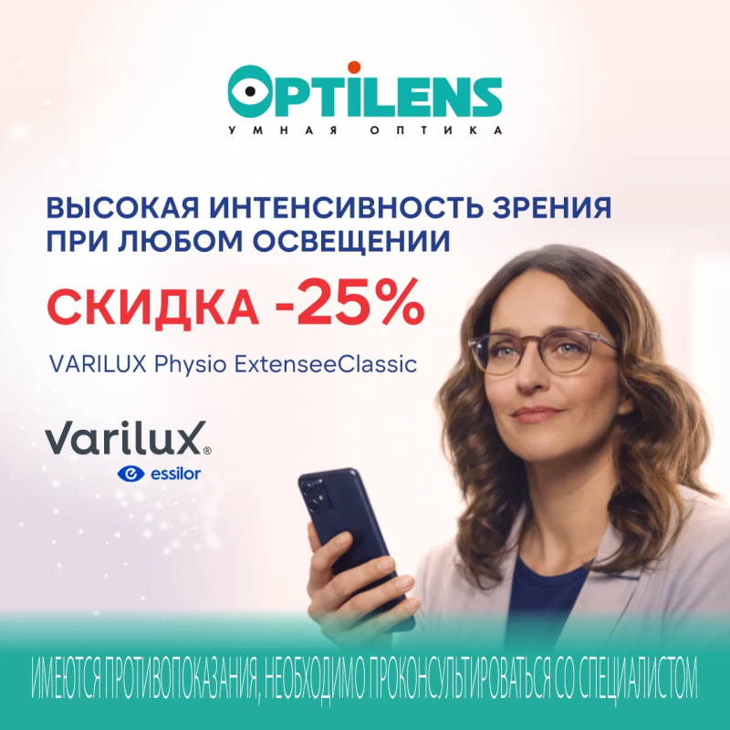 Только до 30.04.26 г. в салонах оптики Optilens действует скидка -25% на современные прогрессивные линзы Varilux Physio ExtenseeClassic! Эти линзы обеспечивают плавный переход между зонами зрения, чёткое зрение на любой дистанции и максимальный комфорт в течение всего дня.